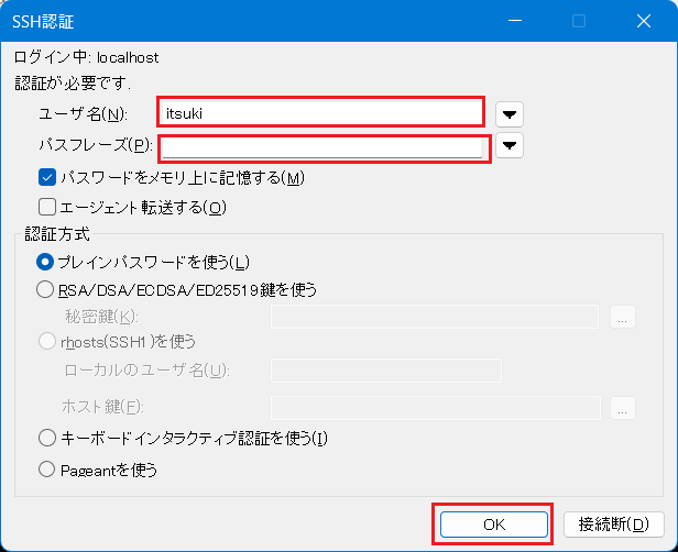 - 「SSH認証」にて,「ユーザ名」と「パスワード」を入力して「OK」を押下します。