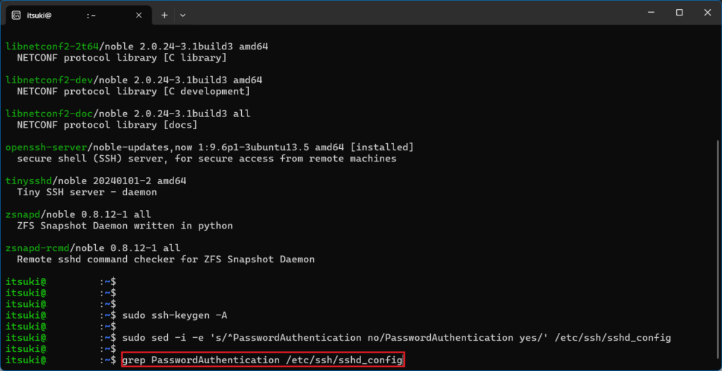 「grep」コマンドを使用して,ファイル内の文字列(「PasswordAuthentication」)検索を実施しています。