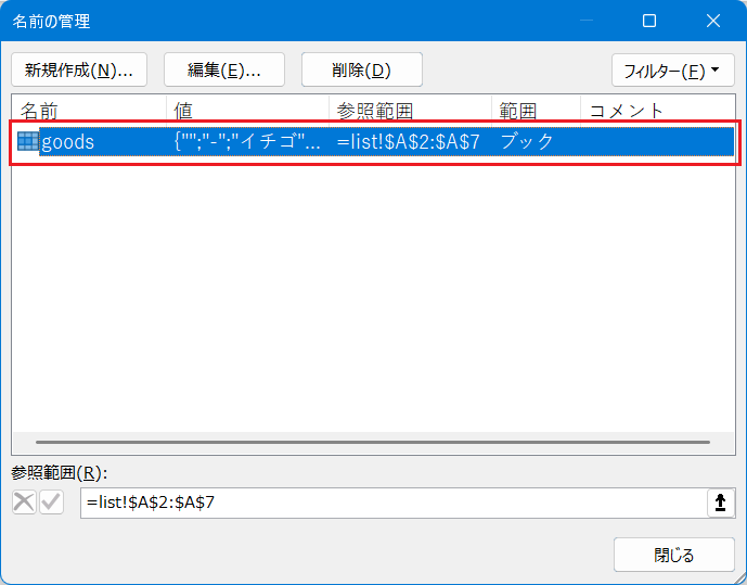 3. 「名前の管理」にて,設定した名前(例:goods)が載っていることを確認します。