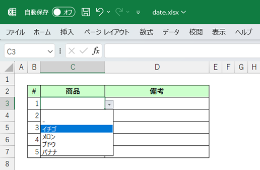 3. 選択した項目がセルへ入力されたことを確認します。