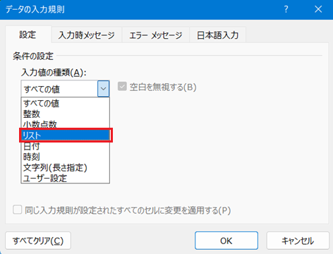 2. 「データの入力規則」にて,「設定」タブの「入力値の種類」にて「リスト」を選択します。