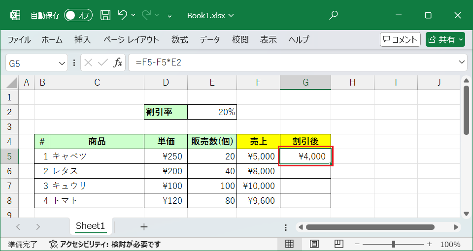 今回の例では割引率の20%(E2セル)を変えたくないため,キャベツの計算式を以下のように変更します。