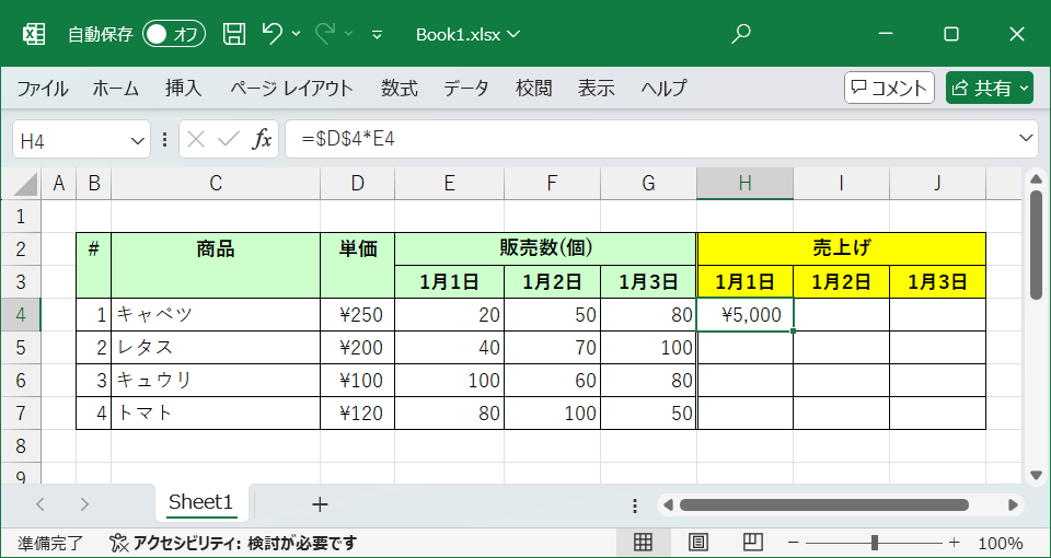 | =ROW() -ROW($B$3) (1) | キャベツ | ¥250 | 20 | 50 | 80 | =D$4*E4 (\5,000) | =E$4*F4 (\1,000) | =F$4*G4 (\4,000) |