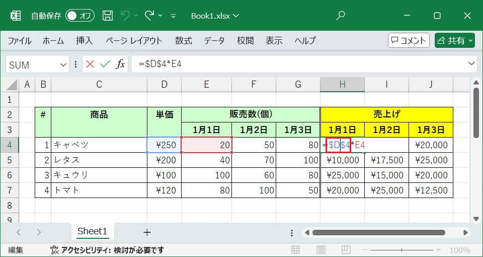 例えば,「レタス」の「1月2日」(I5)は「=$D5*F5」となっており,「レタス」の「単価」および「1月2日」の「販売数(個)」を正しく参照できています。