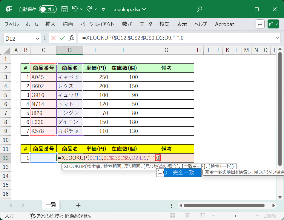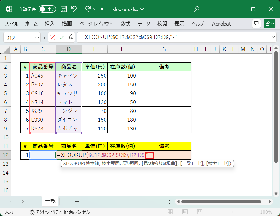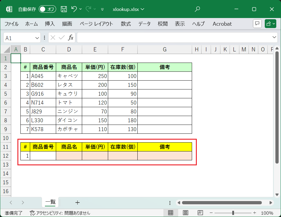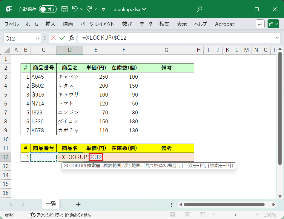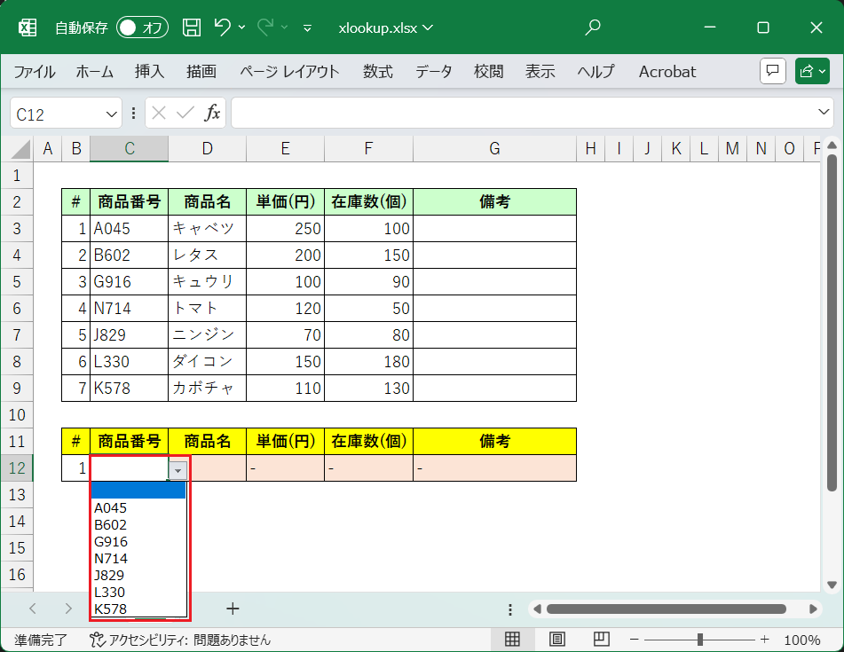 C12セル(「商品番号」)に商品番号を入力して,D12(「商品名」)~G12セル(「備考」)へ商品番号に応じたデータを抽出してみましょう。