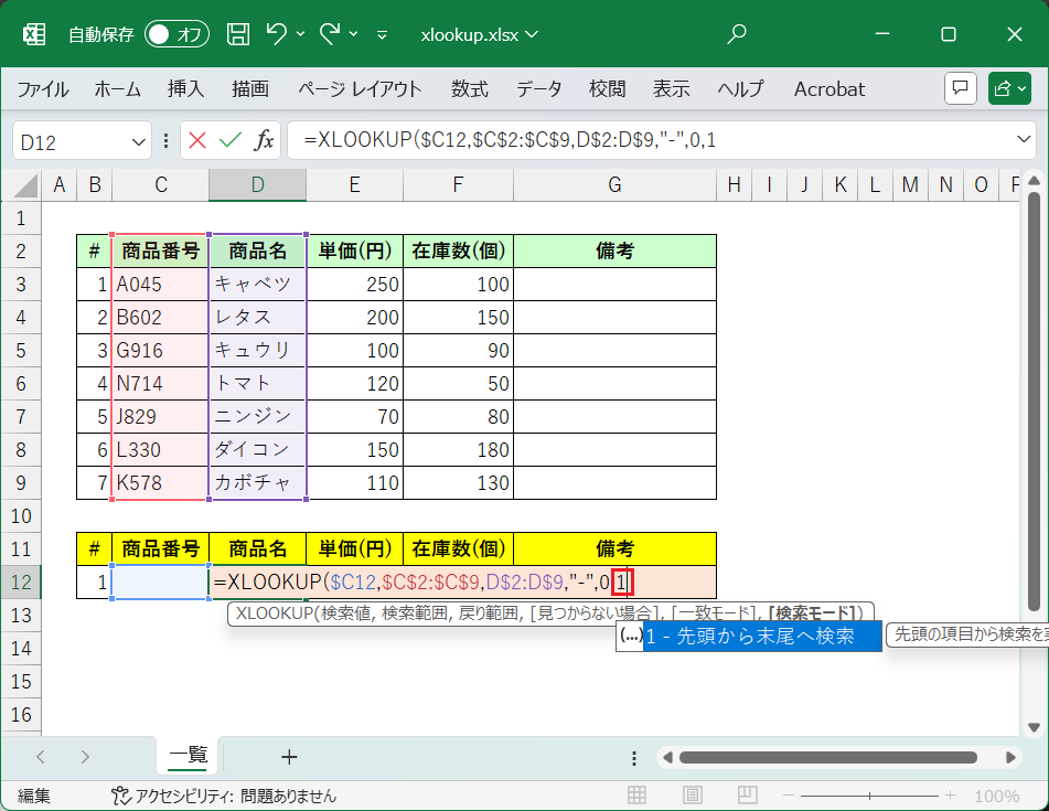 =XLOOKUP([検索値],[検索範囲],[戻り範囲],([見つからない場合],[一致モード],[検索モード]))