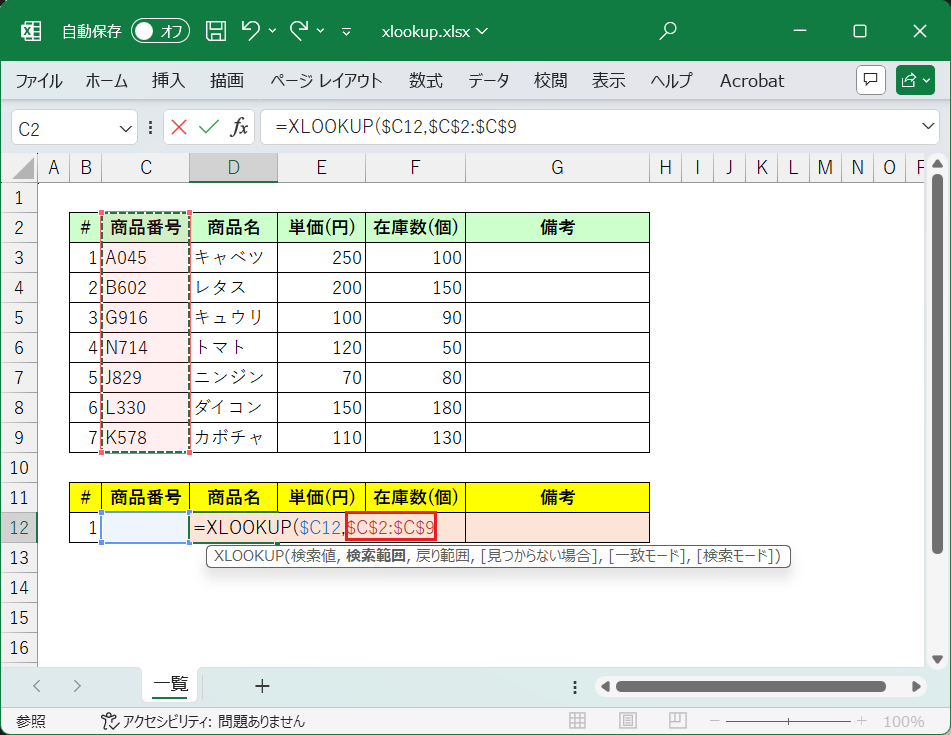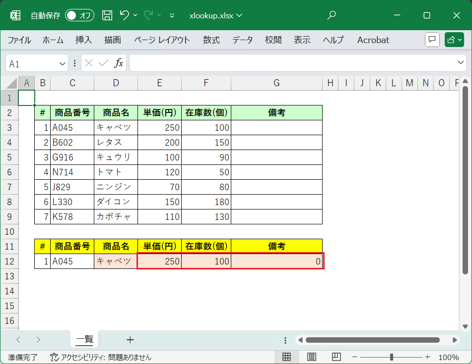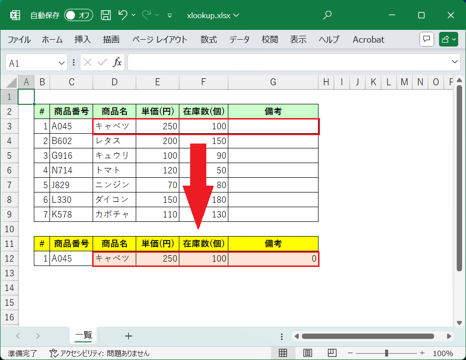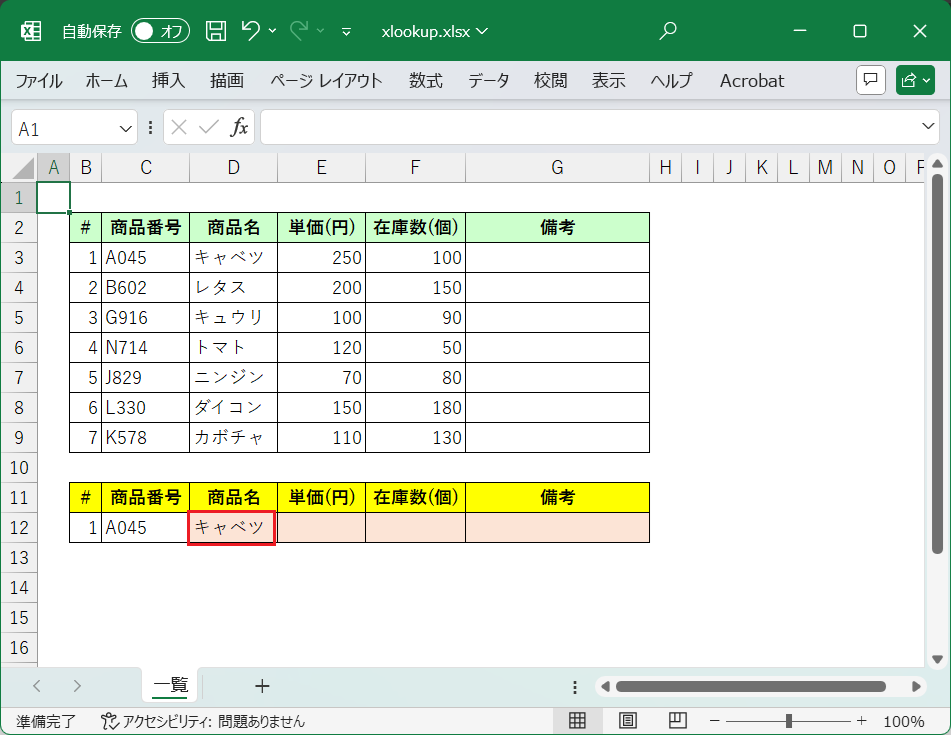 「商品番号」(「A045」)に対する「商品名」(「キャベツ」)を抽出することができました!