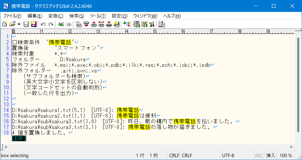 上記の場合,「D:\sakura」フォルダ内の「sakura1.txt」で,「5行目」の「1文字目」から「UTF-8」の文字コードにて「携帯電話」を「スマートフォン」に置換したことが分かります。